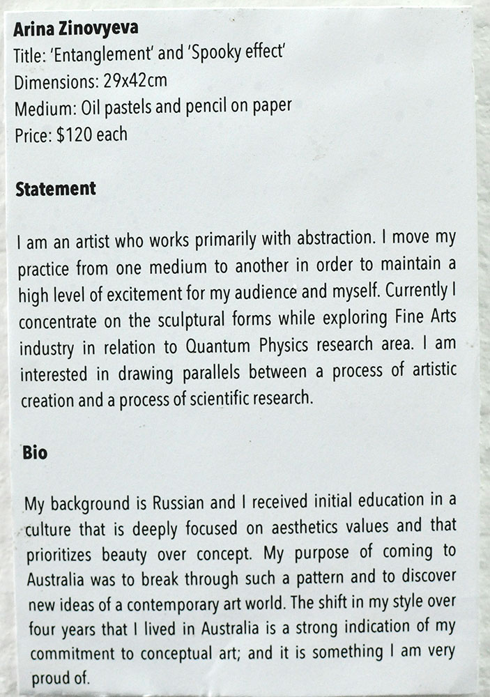 The Shop Gallery on 112 Glebe Point Road hosted my solo exhibition SHELVES. This was my first time curating an exhibition. It was exciting to do everything from selecting what work to show to deciding how to position it in the gallery. That exhibition marked a decade of my creative practice, and I chose a range of styles – intricate pencil drawings and bold abstractions – to show how my interests shifted. The years 2008-2012 were more about intense exploration of physical and emotional journeys and 2013-2014 were dedicated to the analysis of quantum physics and in-depth research of the ways to represent it visually.  What I wanted to show to the audience was a variety of abstract work and my passion for this genre.