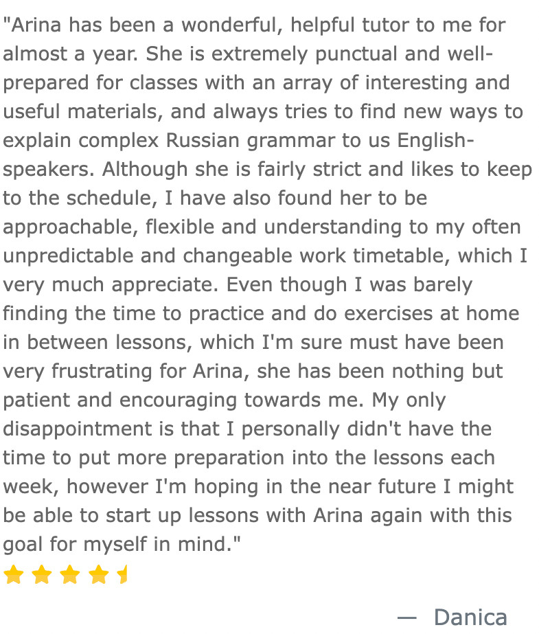 All lessons are interactive: you will be saying Russian words, repeating after me, we will be role-playing short dialogues, and you will be building your grammar and vocabulary bank gradually. I will be giving a homework task after each session so that you can consolidate your learning. Completing each homework will be achievable as long as you schedule time in your calendar to do it. I will give you feedback on your homework every time. Some of my students started learning Russian with me from scratch and now can express themselves pretty well. It’s remarkable to see their progress and I want you to be confident Russian speakers too.
